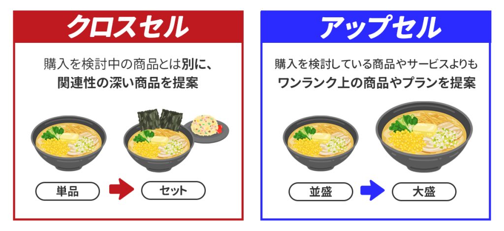 ユーザーが購入した商品や、購入を検討している商品やサービスよりもワンランク上の商品やプランを提案して、顧客単価を向上させるための取り組みです。